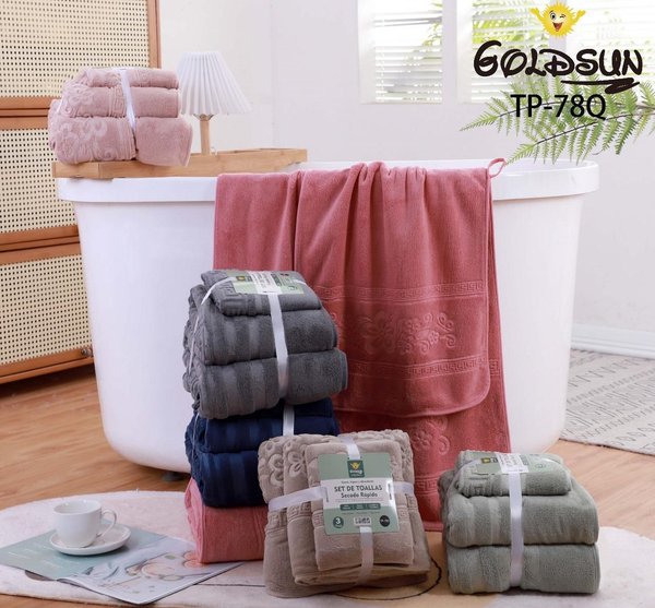 ¡Transforma tu rutina de baño en una experiencia de spa! El Set GOLDSUN TP-78Q es la combinación perfecta de lujo, eficiencia y estilo, ideal para el hogar moderno. Olvídate de las toallas pesadas y que tardan en secar. Con nuestra avanzada Microfibra de Secado Rápido, sentirás una diferencia inmediata.🌟 Características Únicas:Tecnología Quick-Dry (Secado Rápido): 🚀 Listas para usar en mucho menos tiempo, perfectas para un ritmo de vida acelerado o para llevar al gimnasio.Absorción Mágica: 💧 Gracias a la microfibra de alta densidad, absorben el agua de tu piel de forma instantánea y superior al algodón tradicional.Tacto Terciopelo (Plush): ☁️ Extremadamente suaves y mullidas, brindando una caricia de confort en cada uso.Diseño Sofisticado: El elegante borde con patrón greca en relieve (como se ve en el toallón más grande) añade un toque de distinción y alta costura a tu baño.Colores de Tendencia: Disponible en una paleta de colores chic y versátil: Rosa Pastel, Gris Oscuro, Azul Marino, Beige Neutro y Verde Menta.