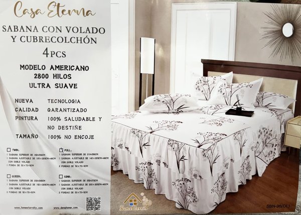 Dale un toque de sofisticación suprema a tu dormitorio con nuestro exclusivo set de Sábana con Volado y Cubrecolchón de 3 piezas de la línea Modelo Americano. Un diseño que transforma tu cama en el centro de todas las miradas.💎 Detalles de Lujo y Confort:2800 Hilos: Disfruta de una suavidad ULTRA SUAVE al tacto, ideal para un descanso reparador y de alta calidad.Volado con Elegancia: Su diseño con Volado Doble (Cama Falda) cubre la base de tu colchón perfectamente, brindando un acabado impecable y un estilo romántico/clásico.Garantía Total: Fabricado con Nueva Tecnología y Pintura 100% Saludable que NO DESTIÑE.Durabilidad: Su material de alta calidad está garantizado para NO ENCOGER con los lavados.📦 Tu Set Completo Incluye:Sábana Ajustable con VoladoCubrecolchónFundas de Almohada (La cantidad varía según el tamaño)📏 ¡Encuentra tu Tamaño Ideal!Disponible en TWIN, FULL, QUEEN y KING.✨ ¡Elige la excelencia de Casa Eterna para tu descanso! ✨🎨 ¡Explora Toda Nuestra Colección! 🎨Tenemos más diseños, colores y estampados disponibles para que combines a la perfección con la decoración de tu hogar. ¡Pregúntanos y crea el santuario de descanso perfecto!